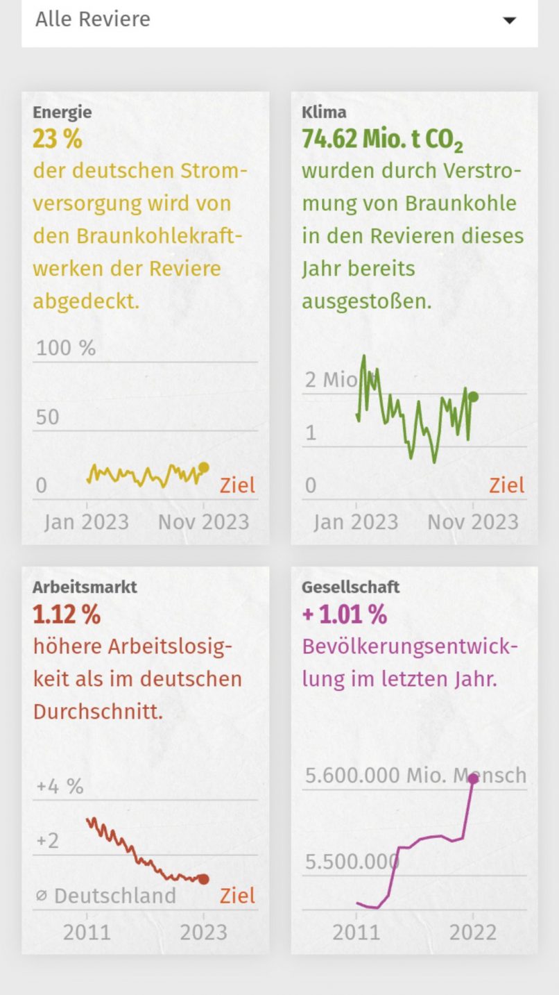 Auf der Webseite werden tagesaktuelle Updates zum bereits investierten Geld, Fakten aus den Revieren und die Hintergründe und Auswirkungen der Investition geliefert. Aufgeteilt in Energie, Klima, Arbeitsmarkt und Gesellschaft werden die verschiedenen Kohlereviere analysiert und Statistiken geben einen Überblick über den Verlauf. Die Story gibt in sieben Kapiteln Informationen über ebendiese Themen.