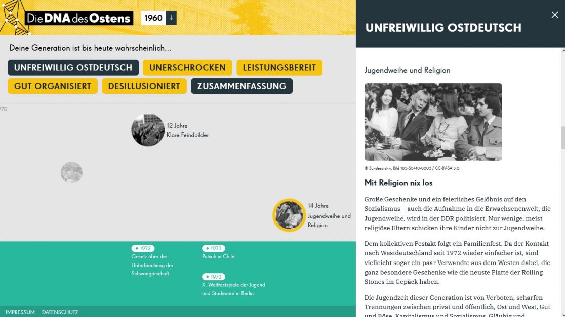 Wie wurde ich, wer ich bin? Ob man genauso tickt wie andere Menschen der gleichen Generation lässt sich im interaktiven Online-Projekt herausfinden. Wer dort sein Geburtsjahr anwählt, begibt sich auf die Suche nach den eigenen Prägungen – und denen seiner Generation, kann schauen, welche gesellschaftlichen Ereignisse und Veränderungen vielleicht Einfluss auf die eigene Entwicklung hatten.
